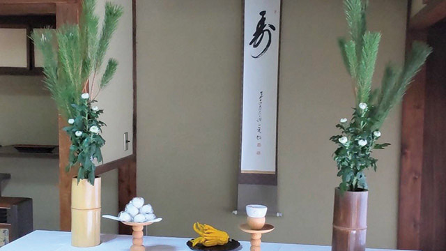 「献茶」には、故人を偲んでの仏式と今ここにあることを感謝して今年も無事であることを願っての神式の二通ございます。当流では、年初に神式で献茶の儀を行います。